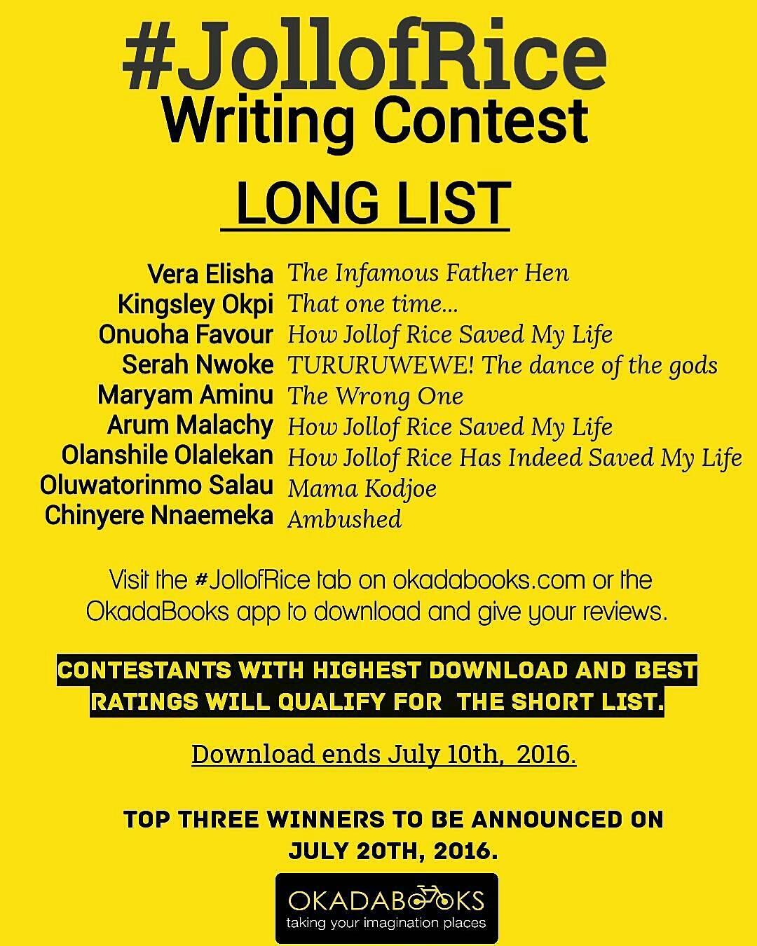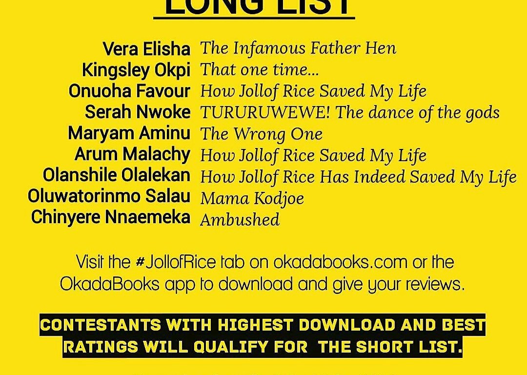 The contestants need your votes by way of downloads, ratings and reviews to be shortlisted for the final stage. To vote, please go to the #JollofRice Contest Tab on your #OkadaBookssapp or simply log on to okadabooks.com to download and review the entries of your favourite contestants.