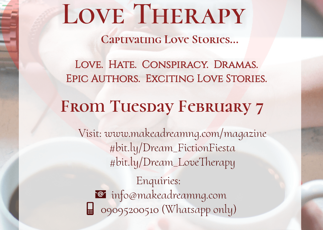 It’s February- the season of love!!! And never before have you had it so good as it’s our first February here at makeadreamng.com. Therefore, to commemorate this season of love, we are delighted to serve you LOVE THERAPY on the platter of our Fiction Fiesta Column!