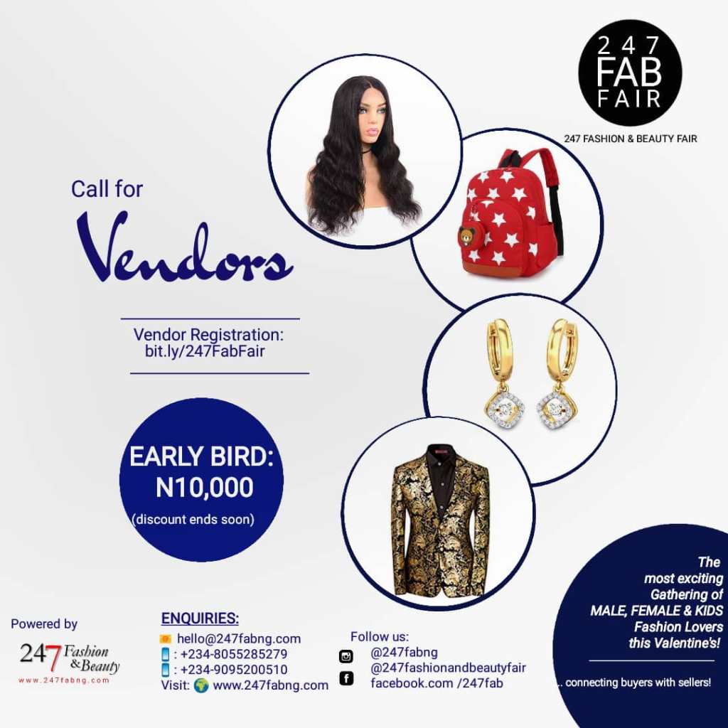 Vendor Registration for 247 Fashion and Beauty Fair is now ongoing. A Vendor stand goes for N15,000 only, while early bird registration goes for N10,000. Early bird discount ends soon.