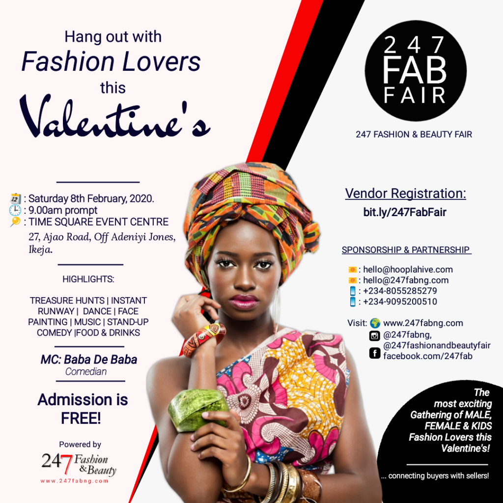 247 Fashion and Beauty Fair is a shopping, fashion and beauty event, slated to give you a memorable Valentine’s; and according to the 247fabng team, it promises to be the most exciting gathering of fashion lovers in Lagos, Nigeria this Valentine’s.